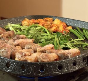 専用の鉄板を使い、お肉に味付け、キムチもしっかり焼いてニンニクやセリなども使い本格的に作ります!!
